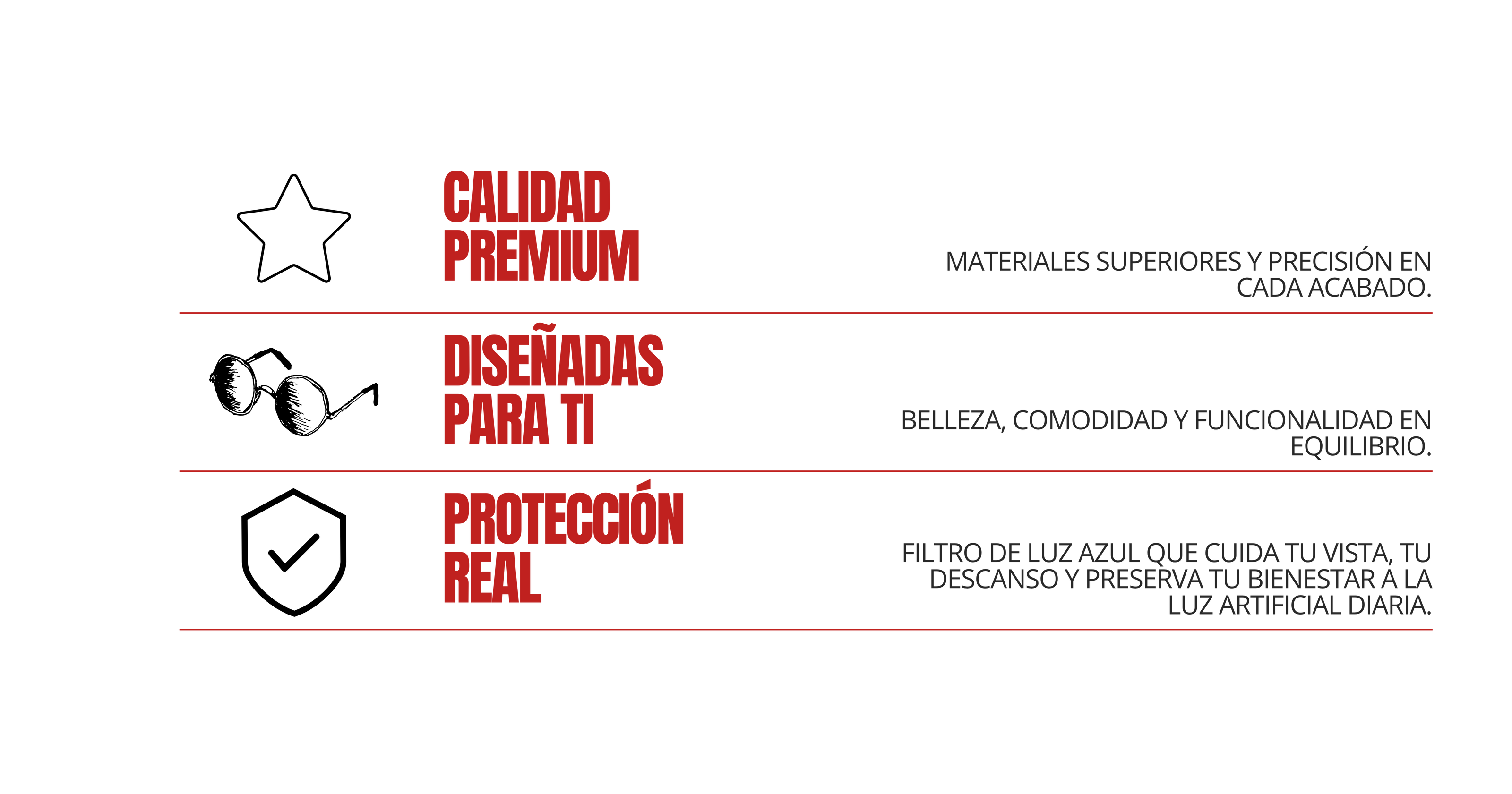 - Diseñadas para el uso diurno, reducen el exceso de luz azul procedente de pantallas, iluminación LED y fluorescente, sin alterar la percepción del color.